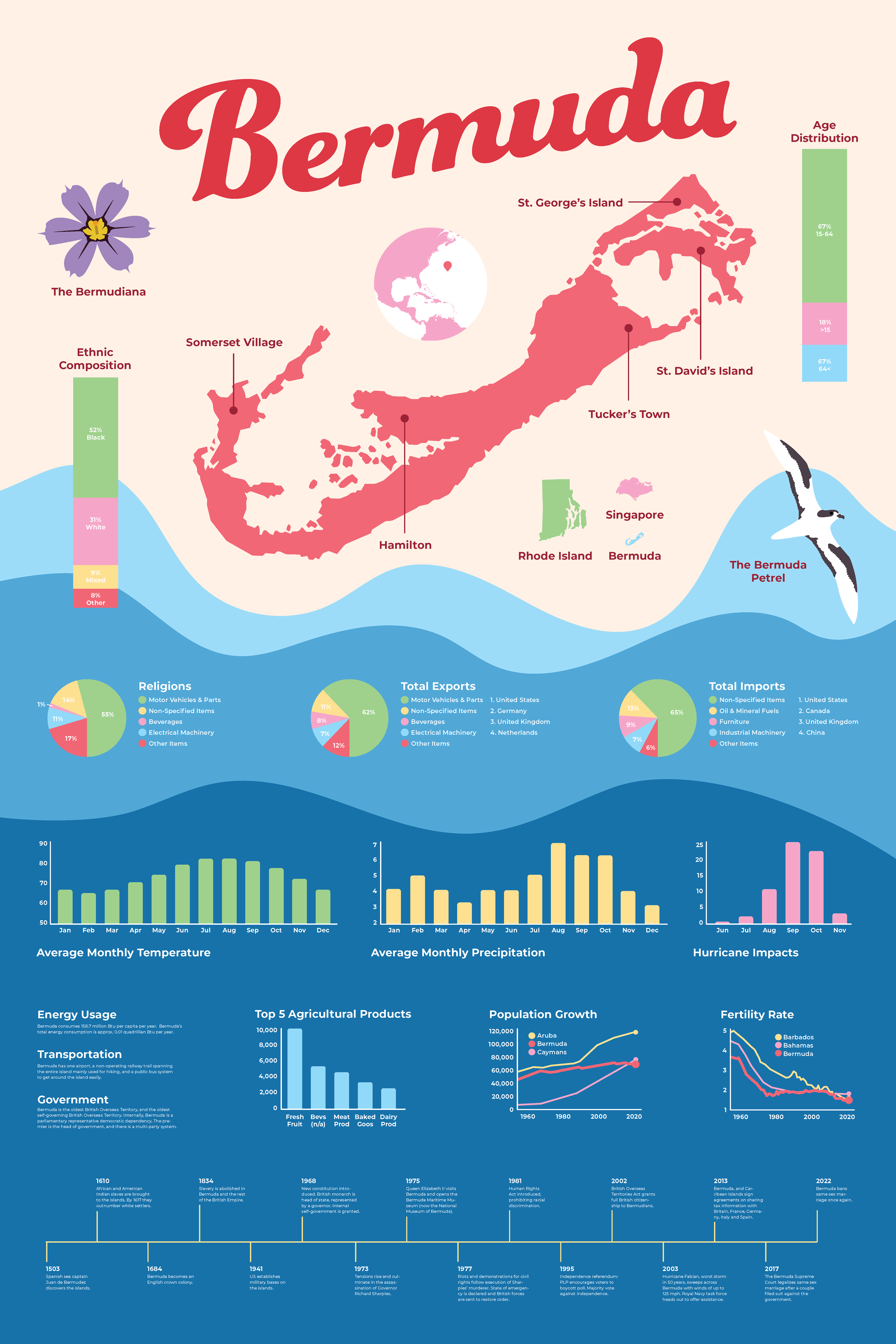 As part of a project to create an informative poster about a country of our choosing, I designed this piece to highlight 30 different data points about Bermuda, including demographics, environmental stats, and more. The colorful and wave-inspired design was influenced by Bermuda’s vibrant culture, architecture, and natural beauty, making this project a really fun and creatively expressive experience for me. Using charts, graphs, and icons, I worked to present the information in a clear and engaging way while bringing a bit of Bermuda’s personality to life.